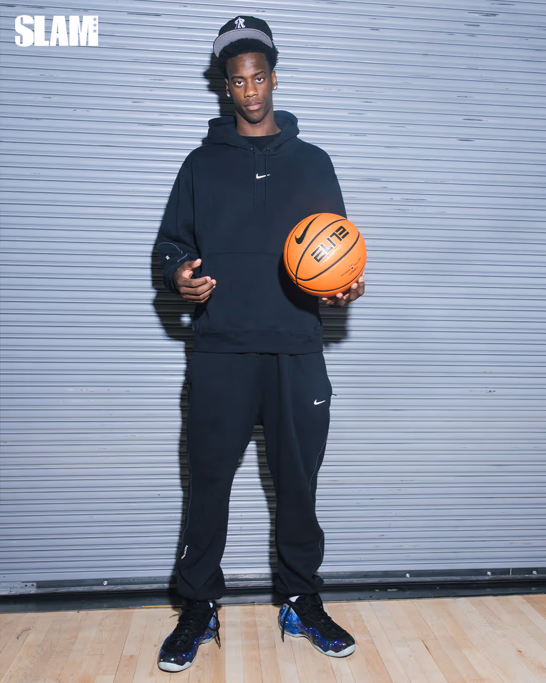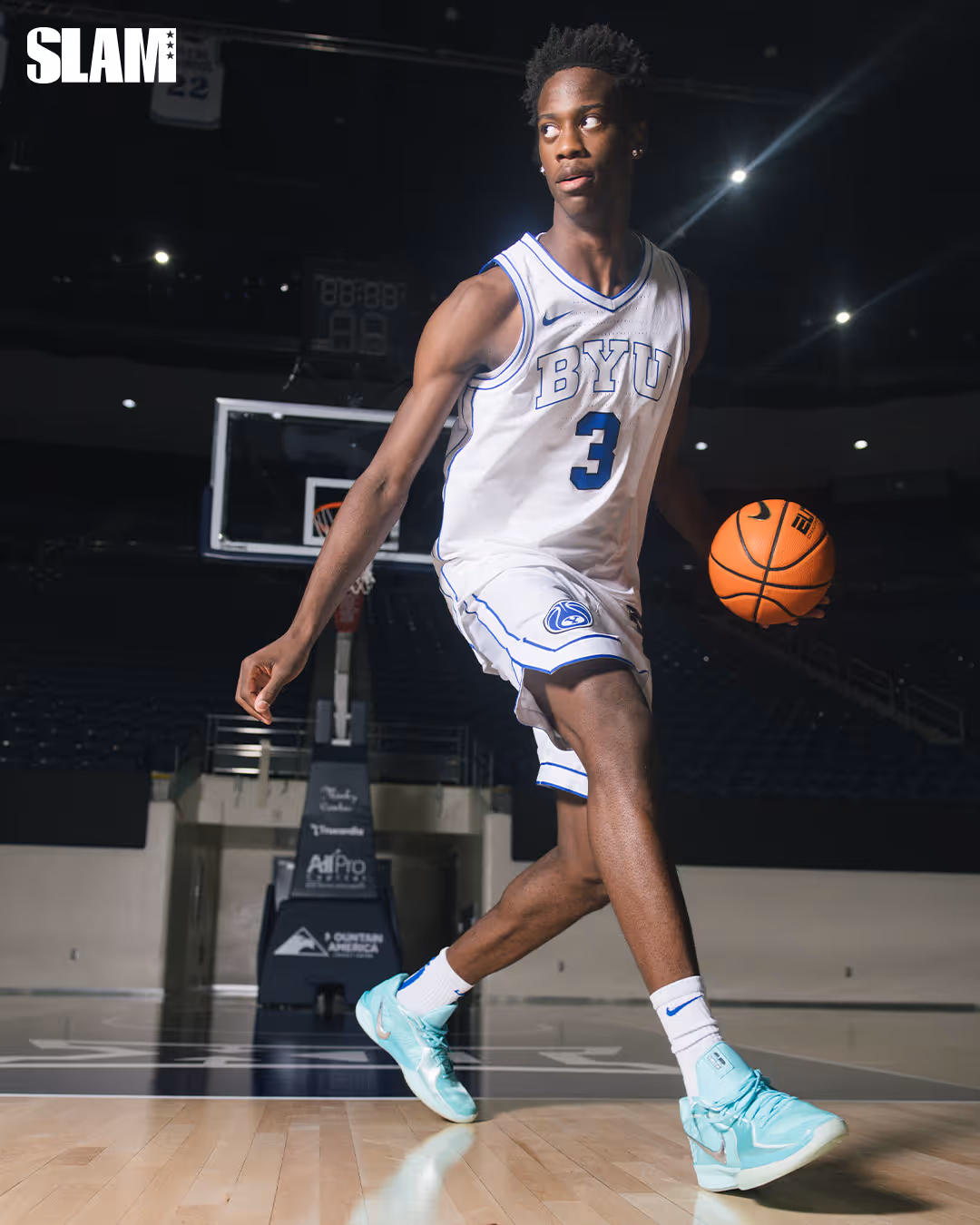 On a calm and quiet Saturday morning in Provo, UT, AJ Dybantsa is cleverly sneaking in some jumpers on the hardwood in between photo breaks at his cover shoot. The Marriott Center, which serves as the home arena of the BYU basketball program, is completely desolated on this mid-August morning. AJ has the entire arena floor (and building) to himself, and he’s taking full advantage of it to take as many jumpers as he can in between pictures, whenever the photographer pauses to switch out lenses or rearrange lighting equipment.