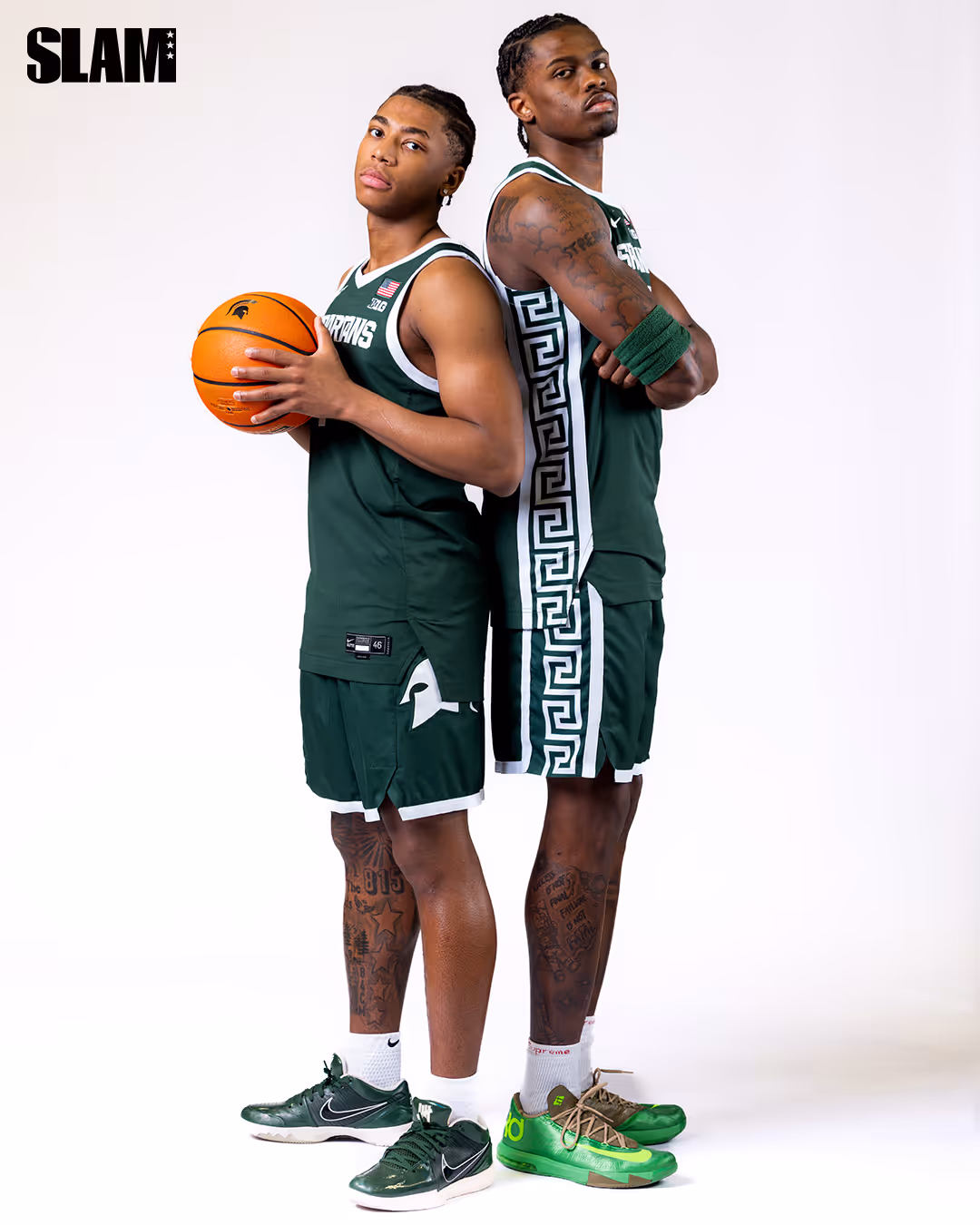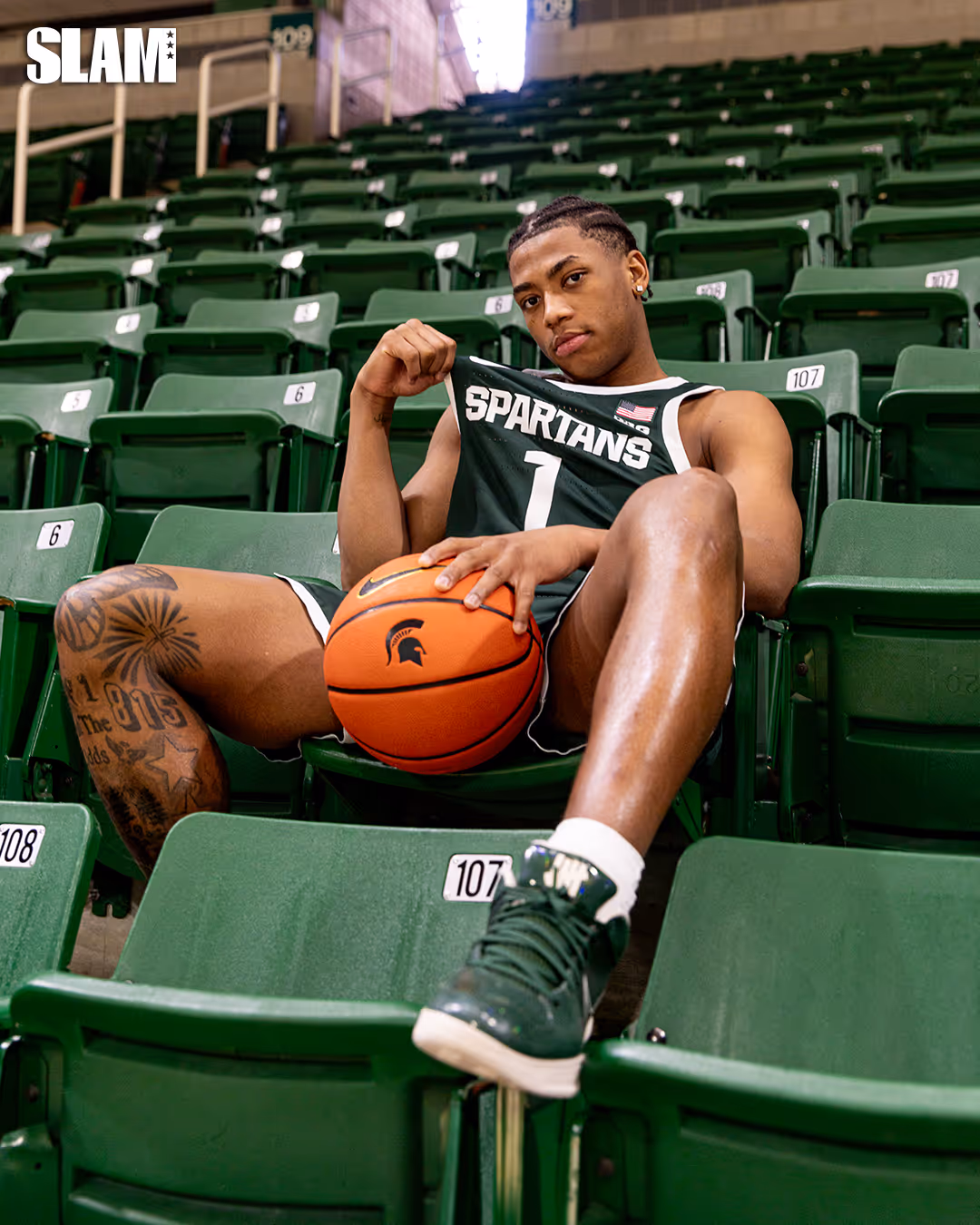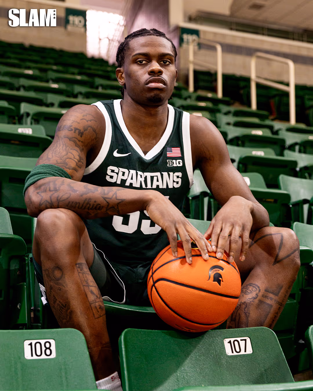 With five wins over teams ranked top-25 in the nation, the 25-5 Spartans are clicking at the perfect time with just one final contest left in the season. Tom Izzo’s reign of securing the best point guards in the country has continued with Jeremy Fears Jr. leading the Spartans with 15.1 points, 9.1 assists [the most in all of college basketball] and 1.3 steals per game. To his left on Michigan State’s first-ever SLAMU Digital Cover is the 6-6 junior that Spartan legend Jason Richardson has crowned “the best dunker when it comes to Michigan State history.” That would be Coen Carr.